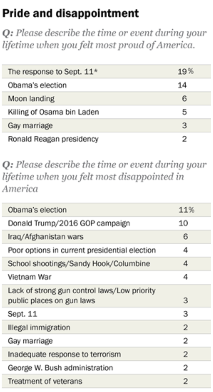 The election of the nation's first Black president was prominent on that list, too. The September 11 events disappointed respondents on a par with gay marriage. The 2 percent who were chuffed with the Reagan presidency were disappointed by the George W. Bush presidency, but didn't G.W. Bush see them through that 9-11 event that gave them such robust American pride?